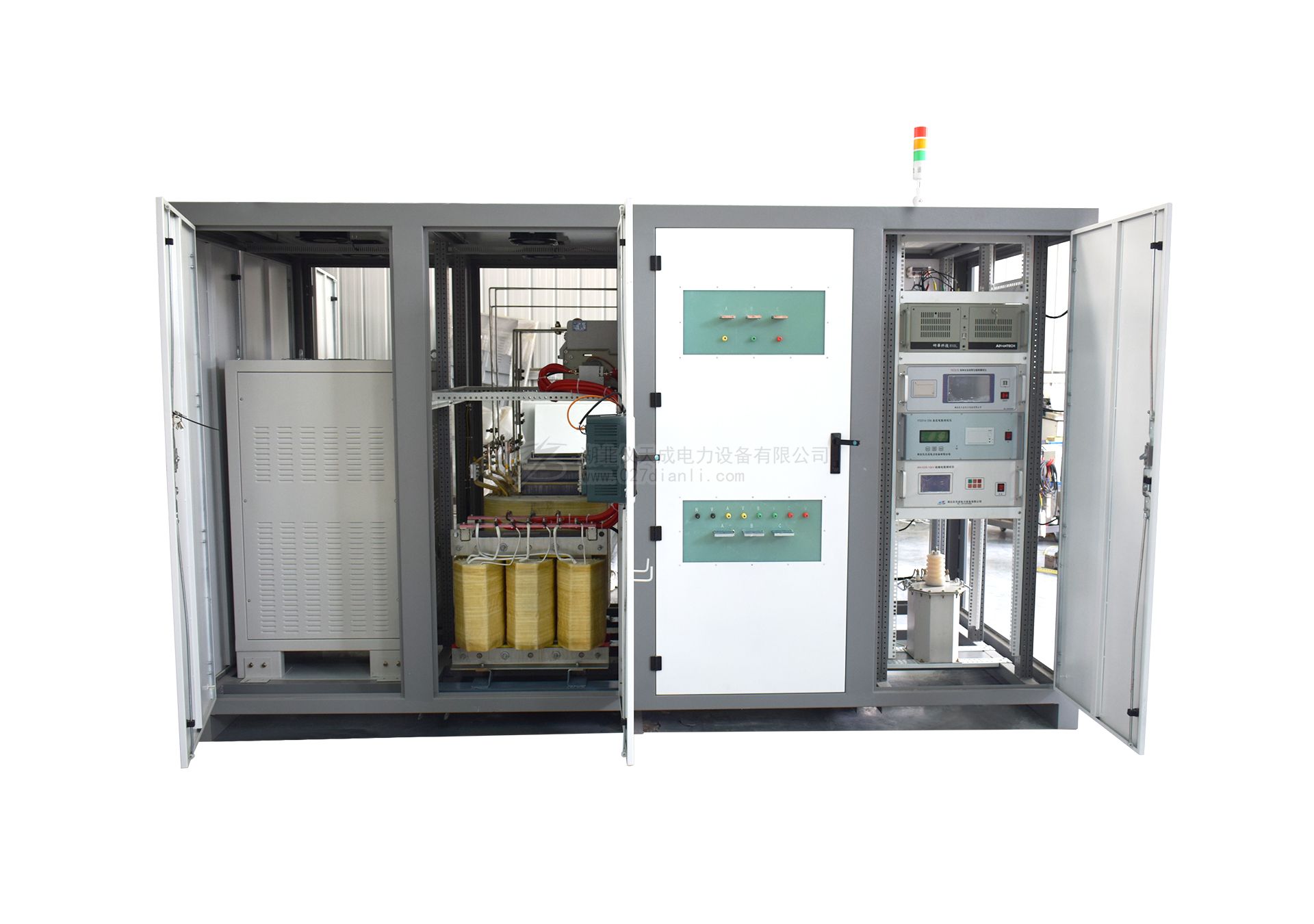 該試驗臺主要是對電力變壓器,配電變壓器的直流電阻及變比測試,空載、負(fù)載特性及感應(yīng)耐壓,工頻耐壓試驗及溫升進行試驗。