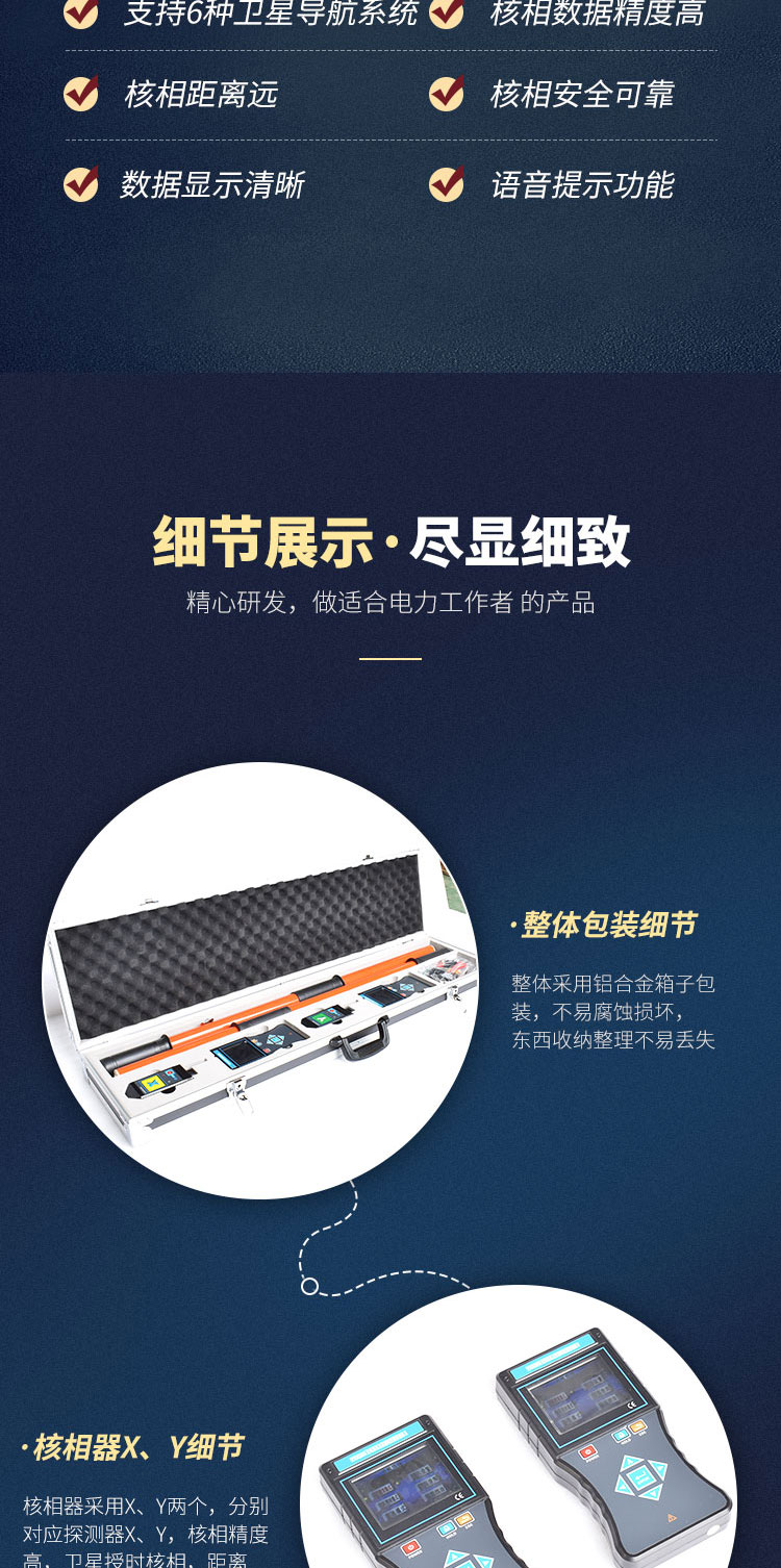 3、測試功能強,空曠地面普通核相距離可達160m,衛(wèi)星授時核相距離大于500km,能對10V~550kV的電壓線路全智能核相,也可用于高壓線路和完全密封的環(huán)網(wǎng)柜低壓感應(yīng)點核相,